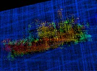 A 3-D image from NOAA Ship Fairweather multi-beam sonar. The profile of the F/V Destination is clearly visible, including the bulbous bow to the right, the forward house and mast, equipment (likely crab pots) stacked amidships, the deck crane aft, and the skeg and rudder.