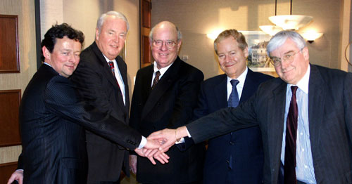 "Completion of the gas pipeline contract represents a major milestone in securing a natural gas pipeline, which will provide hope and opportunity for Alaska's future. Modernizing our oil tax system will provide Alaskans with revenue today," said the governor. "These are two historic events, ones that will define the state's economy for decades to come." ![]() (February 21, 2006) An historic agreement was reached between the state and three major producers on the initial contracts for a Petroleum Production Tax and the construction of a Natural Gas Pipeline. Pictured above from left to right: Tony Hayward (Group Managing Director and CEO of E&P for BP), Frank H. Murkowski (Governor of Alaska), Morris Foster (President of ExxonMobil Production Co.), Jim Mulva (Chairman of the Board and CEO of ConocoPhillips) and Jim Clark (Chief of Staff to Governor Murkowski).