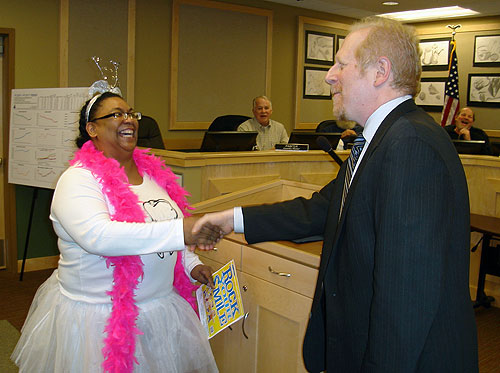 Candy Williams CDA/COA dresses in her best tooth fairy costume and accepts proclamation from Ketchikan Gateway Borough Mayor Dave Kiffer.