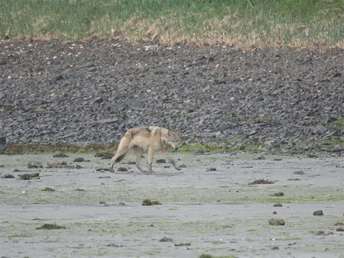 A wolf travelling and foraging in the intertidal zone on Pleasant Island in Alaska (in Hoonah-Angoon Census Area). |