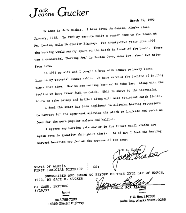 First of all, it is not "common knowledge" that herring are abundant around Juneau, and that "absolutely nobody is up in arms." Attached are two of the letters we received from Juneau residents 11 years after the close of the last sac roe fishery in Lynn Canal. Almost 14 years after the fishery, there was still so much controversy that the Juneau Empire saw fit to fun a two page story entitled "Mystery of the Missing Herring" in its December 10th, 1995 edition. Although there have been a little scattered spawn observed from time to time, it pales by comparison to what was once one of the largest biomasses of herring in Southeast Alaska. Mr. Porter's attack on John Harrington was totally without merit. He took offense when John pointed out all of the sac roe fishing areas in Southeast Alaska that no longer exist. (John didn't even mention all of the bait fishery areas that are also depleted.) These areas were harvested under ADF&G's conservative harvest guidelines". Mr. Porter was quick to point out that two of these areas will once again be open. ADF&G's strategy is to knock them down, wait for ten or twenty years (or more) until they reach a minimum threshold, and go back and knock them down again. These are the areas Mr. Porter calls "sporadic". The problem is, as John correctly pointed out, most of these areas have remained depleted. How good can this be for the rest of the ecosystem which depends so much on herring for food, to have these vast areas continuously depleted? For one thing, it puts enormous pressure on the remaining stocks, as we have seen in West Behm Canal, with over 100 whales feeding simultaneously for a solid month before moving on. ADF&G has no way to quantify or adjust their fishery for this kind of natural mortality, which is one of the reasons why they continue to over-harvest these vital fish. It seems that Mr. Porter has discovered a vast new species of herring in Lynn Canal, one that somehow reproduces without spawning, and is only visible to the trained eye of the herring fishermen and the ADF&G. It reminds me of another of Mr. Porter's explanations regarding what happened to the thousands of tons of herring in Carroll and George Inlets. The answer to this question, said Mr. Porter, is that "the Loran Station lights scared them away!" Andy Rauwolf