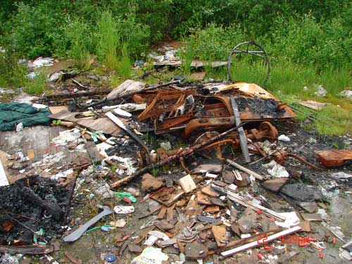 After most of the people left for the day, and Robert McRoberts had removed the cars and large auto parts that had been partially buried under rocks and dirt in the Mile 7 rock pit, a husband and wife showed up to pick up and bag the small stuff that were left in the rock pit. I worked with them several hours in picking up trash while they continued to diligently work into the evening. I enjoyed conversing with them while we worked. I then left to help one of the Coasties from the Electronic Support Detachment clean up a different area that I had previously located. When I returned, the rock pit was very clean and the bags of trash were placed along the road. I recently learned that the health of the husband that worked so hard in the rock pit had deteriorated to such an extent that he, although relatively young, is now in a health care facility. The reason I mention these memories of the “Road Tour” is because I returned to the rock pit in response to information from the State Troopers that there was a junk vehicle located there. The following pictures of the rock pit show what people have done, after the work of Robert McRoberts and that couple six years ago. Jerry Cegelske Received June 30, 2011 - Published July 05, 2011