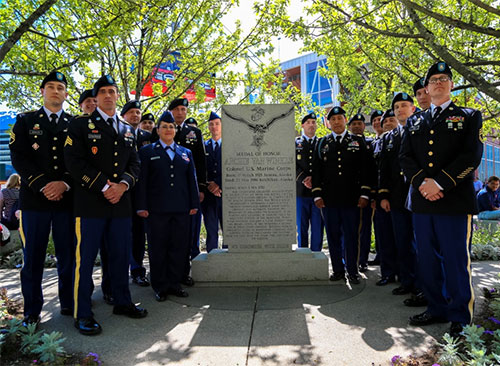 Soldiers and Airmen assigned to the 103rd Civil Support Team perform a memorial service for the sole Medal of Honor recipient born in Alaska, retired Col. Archie Van Winkle, United States Marine Corps, for his heroism during the Korean War, at his memorial site in downtown Juneau, June 23, 2016. The memorial service was conducted after the unit concluded a professional development leadership seminar based on lessons learned from the Korean War.