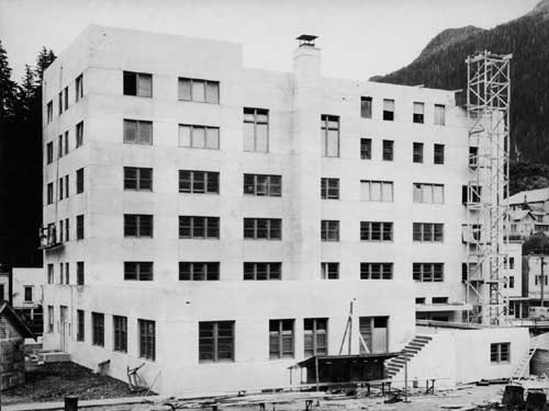 The federal grand jury which continued to meet every six months to handle cases also continued to press for a new Federal Building. In 1923, it issued a special report that found the present building "dilapidated beyond reasonable repair and overcrowded past endurance." The report - printed in full in the Ketchikan Chronicle - also noted that the grand jury was concerned about the money the federal government was spending to rent space in other Downtown buildings. "However all that has been done or may be done (to renovate the building) here constitute but temporary or wasteful makeshifts," The report stated, it went on to list the various federal agencies that were spending a total of $9,000 a year to rent space. "The close proximity of the public school building to the Court House is also a source of great annoyance, it being frequently necessary to suspend the business of the District Court during school recesses because of the noise made by the children," Grand Jury Foreman Forest Hunt wrote. In 1924, the Ketchikan City Council sent an official plea to the Federal Government for a new facility. The request noted that the new school house under construction would further cramp the hillside locale. The city resolution suggested that it could provide a better site for a new federal building and that it would happily exchange land near the downtown for the court house site, which it would then turn into a playground. The next year, 1925, the federal grand jury once again petitioned the federal government for new building. ![]() May 1, 1937 - Photographer: G.A. Geib Donor: John Granger, Tongass Historical Society Photograph Courtesy Ketchikan Museums "The Grand Jury examined the Federal building and found it in a very unsatisfactory, unsanitary and unsafe condition," wrote Jury Foreman J.D. Littlepage. "There is no question it is beyond repairThis building is, moreover, a firetrap and most unsafe place to confine prisoners." That year, the Ketchikan Commercial Club the forerunner of the Ketchikan Chamber of Commerce also added its voice with a resolution seeking a new federal building. But, while federal officials sent various letters of support, no action was taken on the request and the court house and federal offices continued to share the small hilltop with the new Main School and the numerous private dwellings. Finally, a decade later, relief came to Ketchikan in the form of the WPA. The Work Projects Administration was one of the largest of the government programs that was developed during the Great Depression to combat wide-scale unemployment by creating jobs. Billions of dollars were spent by the federal government on construction projects across the country that put millions of workers back to work, at least temporarily. "The Cleveland Ohio architectural firm of Stanley-Brown, Harris and Robinson designed a terra cotta-embellished semi-hexagonal building in 1933," Alison Hoagland reported in her 1993 book "Buildings of Alaska." "When construction bids exceeded the allotted amount, the firm redesigned, ending up with this five 12 story reinforced concrete building." In September of 1935, the Ketchikan Chronicle reported that new plans for a federal building had been revealed. The Chronicle reported that the treasury department planned to build a concrete building that was three stories high with a basement and penthouse which would hold a weather station. The first and second floors would hold the post office and the federal courthouse. At the time, there were alternate plans to include a jail on the premises. The Chronicle also reported that an initial $300,000 appropriation for the building had been supplemented with an additional $100,000. More than two years passed before construction started. The construction company of JB Warrack won the $350,000 contract. ![]() Photographer: Otto C. Schallerer Donor: Fred Greuter, Tongass Historical Society Photograph Courtesy Ketchikan Museums