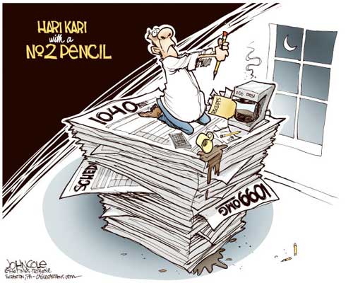 A: I remember news reports about the Clintons deducting boxes of old underwear back in the 1990s, but don't get your hopes up. It's doubtful your deduction will be as big as the one generated by Bill's boxers. Q: I am self-employed and earned $50,000 last year. I can make more working longer hours, but it seems like every extra dollar is taxed at 50 percent. -- Concerned in Colorado A: I hate to break it to you, but you are mostly correct. You are in the 25-percent federal income tax bracket. Social Security and Medicare total 15.3 percent (though there is a temporary 2 percent break). State income tax is 3.07 percent and local is 1 percent. Every dollar you earn beyond your current income is taxed at 44.37 percent. Q: My dog stopped panting, but now my wife is panting! -- North Dakota Norm A: Don't worry. Panting is a common affliction for Americans this time of year, as they spend precious hours complying with complex tax laws. Give your wife some bourbon. Q: Someone told me that I am paying taxes on gasoline, utility bills, retail goods and many other things I am not even aware of. -- Perturbed in Pennsylvania A: That is correct. If you were to calculate all the taxes you are paying, you would discover that well more than half your income is funding one tax or another. If America doesn't get its spending under control, you'd better hold tight to your wallet, because taxes are going to get worse.